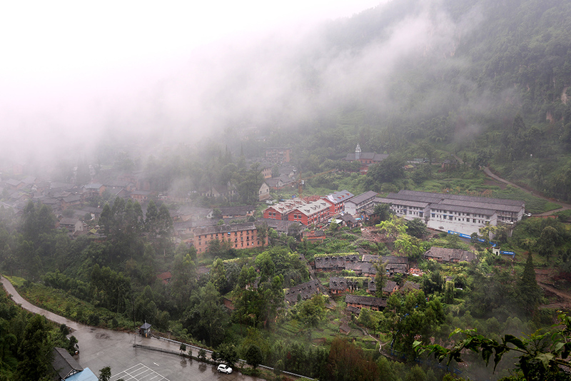 沿蓮花村峽谷爬行6公里,張多總經(jīng)理一行來到海拔位置較高的芭蕉溝白石崖山頂,這兒是俯瞰芭蕉溝工業(yè)古鎮(zhèn)的最佳觀景點(diǎn)之一。云霧繚繞中的芭蕉溝,蘇式、英式和傳統(tǒng)小青瓦建筑鱗次櫛比,山巒疊嶂,像世外桃源般的美麗。鄉(xiāng)村公路已經(jīng)修到白石崖懸崖邊,只需要再硬化兩三百米,公路就可以連接芭蕉溝旅游車站。
