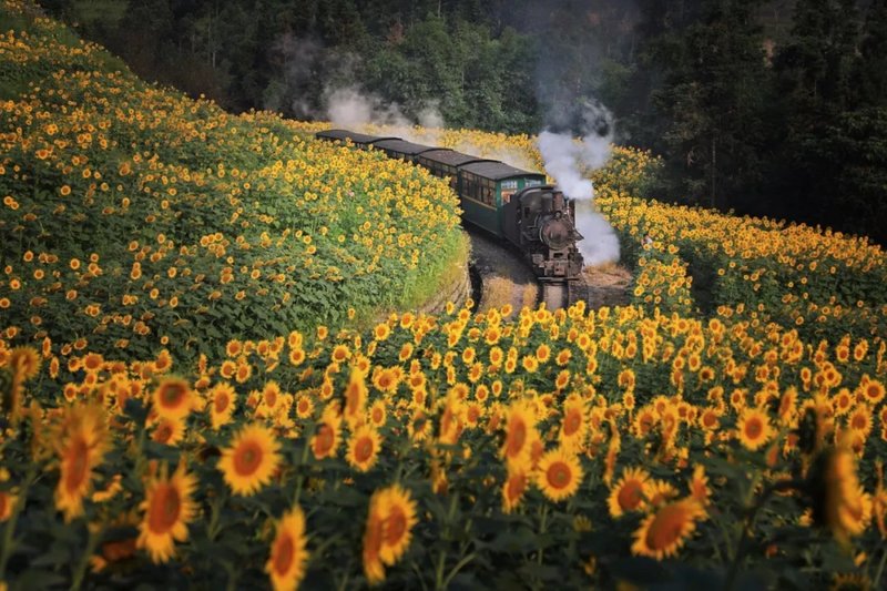 在四川100個(gè)最美觀景拍攝點(diǎn)之一的芭石鐵路段家灣景點(diǎn),15畝共計(jì)8萬株向日葵于9月初全面綻放。層疊壯闊的向日葵花海齊刷刷向陽而立,小火車鳴響汽笛吐露蒸汽從花間蜿蜒駛過,稀罕又震撼的景觀呈現(xiàn)引爆了一波波媒體報(bào)道與旅游觀光熱潮。