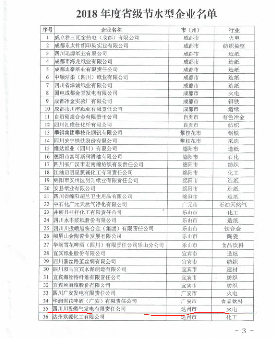為促進(jìn)四川省工業(yè)領(lǐng)域節(jié)約用水,由四川省水利廳、四川省經(jīng)濟(jì)和信息化廳共同組織對(duì)四川省火電、鋼鐵、紡織、造紙、石油煉化5大行業(yè)規(guī)模以上企業(yè)開(kāi)展了“2018年度省級(jí)節(jié)水型企業(yè)”的評(píng)選活動(dòng)。經(jīng)專(zhuān)家評(píng)審和現(xiàn)場(chǎng)核驗(yàn),最終評(píng)選出41家節(jié)水型企業(yè),川投氣電公司名列“2018年度省級(jí)節(jié)水型企業(yè)”榜單。