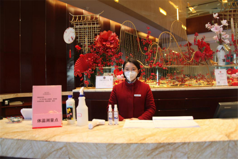 在酒店防控工作上,在前臺、餐娛部設檢查點,對來往所有人員,進行體溫登記,籍貫登記分類,實時具體掌控信息。并備有大量醫(yī)用防病毒口罩,體溫測量儀、免洗消毒洗手液、醫(yī)用消毒酒精等。每日溫馨提示客人出行佩戴口罩,少聚會,室內(nèi)常通風,勤洗手,如有不適及時就診。對酒店餐廳、廚房、客房進行消毒,確保安全衛(wèi)生。