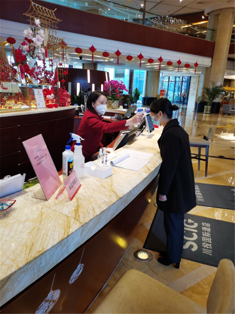 在四川還未出現(xiàn)首新型冠狀病毒感染時,前廳部就召開了部門緊急會議預(yù)警防控,重點防控,提前準備了重要的防疫物資,口罩、消毒酒精、板藍根沖劑及應(yīng)急醫(yī)療箱,每天免費為員工及客戶提供口罩、消毒液等防護物資。前廳部要求部門提高警惕,嚴控出入,準確檢測,在東大門設(shè)立體溫測量點,部門員工上崗前必須進行體溫測量,如實登記《前廳部在崗員工體溫監(jiān)測表》。前廳部要求既確保證服務(wù)質(zhì)量,又廣泛宣傳疫情,對所有的進店客人,都由禮賓或者前臺員工對其進行體溫測量與疫情防控的信息詢問。在疫情逐漸嚴峻的情況下,前廳部門員工們張貼告示,不厭其煩地對來往客人進行溫馨提示,始終把最可愛的微笑留客人,把最好的防護物資優(yōu)先提供客人,口罩始終先發(fā)厚款,再發(fā)薄款,消毒水始終備足。 疫情牽動人心,但前廳部那群可愛的人始終堅守崗位,認真熱忱,為疫情陰霾中的人們帶來了動人的暖意。