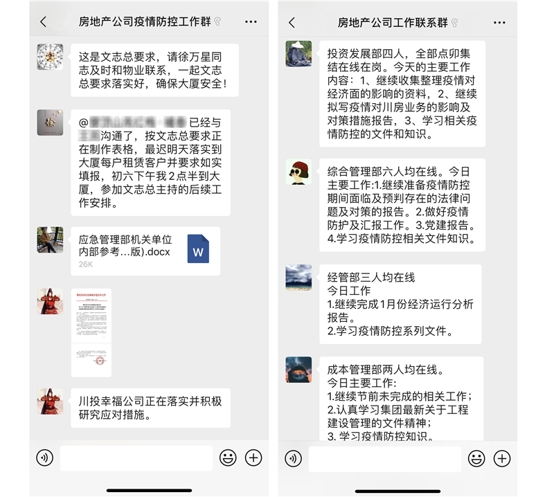 居家網(wǎng)絡(luò)辦公,變的是工作地點(diǎn),不變的是川房人對(duì)公司的責(zé)任。2月10日公司開(kāi)始有序復(fù)工,為保障公司和員工的安全,實(shí)行帶班領(lǐng)導(dǎo)+部門(mén)負(fù)責(zé)人+一般員工到川投大廈值班值守、其余人員居家辦公的工作模式,通過(guò)“川投云平臺(tái)”、“企業(yè)微信”等在線(xiàn)辦公軟件進(jìn)行工作溝通,明確工作內(nèi)容和目標(biāo),帶著問(wèn)題和解決辦法進(jìn)行會(huì)議和日常交流。在線(xiàn)對(duì)每日進(jìn)行工作總結(jié)和復(fù)盤(pán),確保疫情防控期間各項(xiàng)工作不斷檔、不脫節(jié)。
