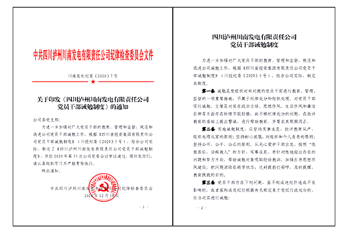 為加強(qiáng)對(duì)黨員干部的教育、管理和監(jiān)督,進(jìn)一步規(guī)范和改進(jìn)公司黨員干部誡勉工作,近日,川南發(fā)電公司根據(jù)川投集團(tuán)黨員干部誡勉的有關(guān)制度,制定印發(fā)了《四川瀘州川南發(fā)電有限責(zé)任公司黨員干部誡勉制度》。