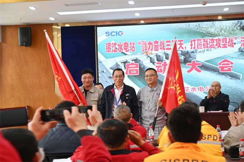 會(huì)上,徐孝剛向各黨員先鋒隊(duì)授旗,要求黨員同志要發(fā)揮先鋒模范作用,在項(xiàng)目建設(shè)過(guò)程中率先垂范,以實(shí)際行動(dòng)激勵(lì)和引導(dǎo)全體建設(shè)隊(duì)伍敢于擔(dān)當(dāng)、勇于奉獻(xiàn),切實(shí)為項(xiàng)目順利推進(jìn)發(fā)揮先鋒模范作用。之后徐孝剛作《乘勢(shì)而上勇?lián)?dāng),兄弟齊心誓斷“金”——堅(jiān)決打好打贏銀江水電站大江截流攻堅(jiān)戰(zhàn)》動(dòng)員講話。徐孝剛強(qiáng)調(diào),接下來(lái)這三百天,是一場(chǎng)緊迫性、關(guān)鍵性、決定性、生命性的“戰(zhàn)爭(zhēng)”,直接決定著2021年大江截流目標(biāo)能否如期實(shí)現(xiàn),直接決定著銀江水電站2025年首臺(tái)機(jī)組能否發(fā)電,直接決定著各參建單位的共同利益。