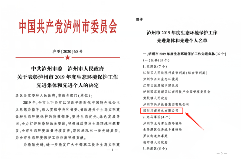 近日,公司被中共瀘州市委、瀘州市人民政府授予“瀘州市2019年度生態(tài)環(huán)境保護(hù)工作先進(jìn)集體”稱號,也是此次瀘州市表彰的39個先進(jìn)集體中僅有的3家工業(yè)企業(yè)之一。