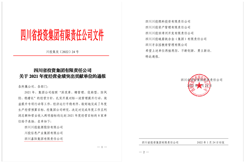 碩果累累,喜訊連連。1月25日,川投集團召開2022年度工作會,會議表彰了2021年度經(jīng)營業(yè)績突出貢獻單位和信息宣傳工作先進單位,嘉陽集團公司喜獲兩項榮譽。