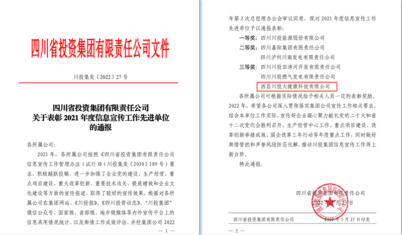 近日,西昌大健康公司榮獲川投集團2021年度信息宣傳工作“三等獎”。