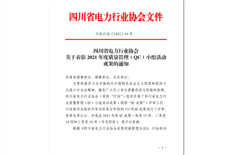 5月11日,四川省電力行業(yè)協(xié)會組織開展的省電力行業(yè)2021年度質(zhì)量管理(QC)小組活動成果評審結(jié)果揭曉,田灣河公司《提高生產(chǎn)管理信息化系統(tǒng)通信程序運行穩(wěn)定性》《提高監(jiān)控系統(tǒng)LCU模件試驗效率》兩項QC活動成果榮獲三等獎。