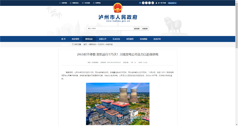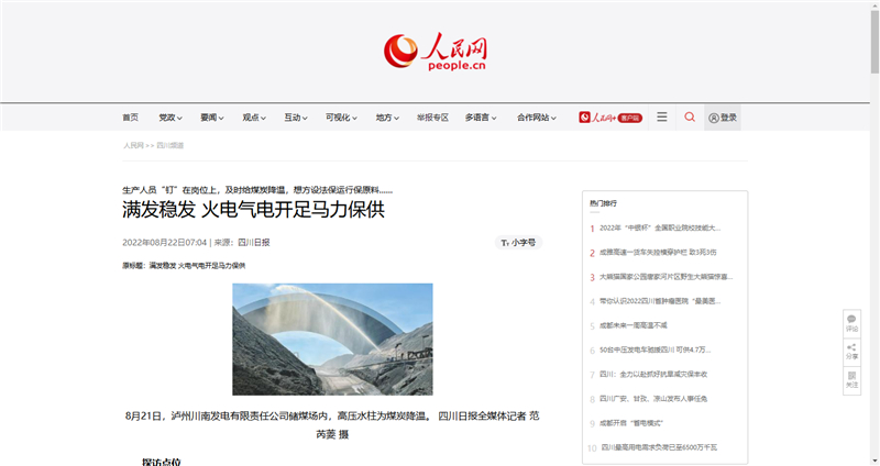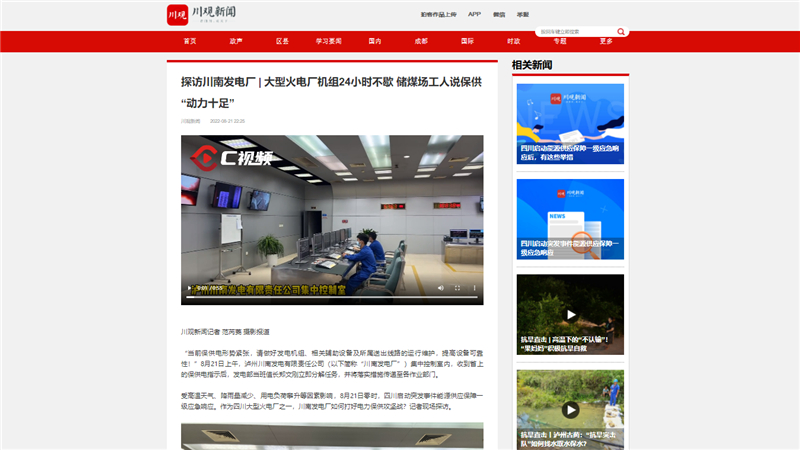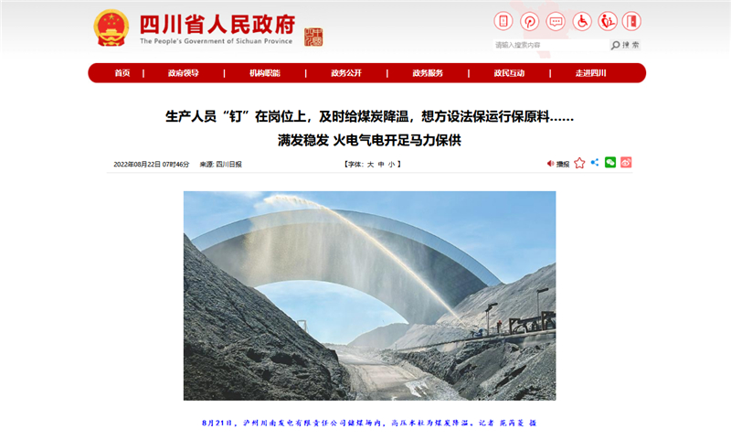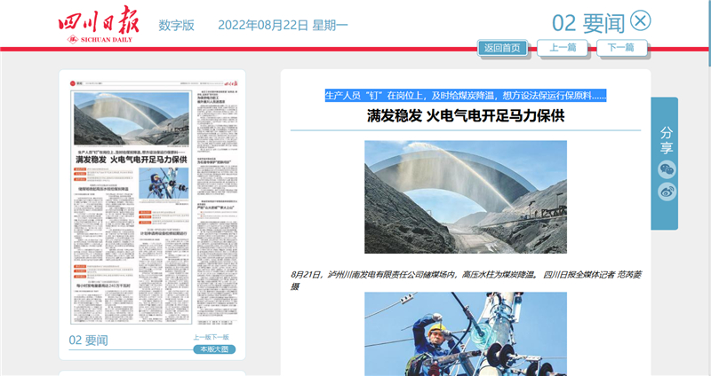 四川日報(bào)、華西都市報(bào)、瀘州日報(bào)、瀘州廣播電視臺等省市新聞媒體紛紛到公司生產(chǎn)現(xiàn)場探訪,實(shí)地了解公司保電舉措、發(fā)電情況等,并以《大型火電廠機(jī)組24小時(shí)不歇 儲煤場工人說保供“動力十足”》《每日發(fā)電2640萬度 上網(wǎng)電量占瀘州50% 川南發(fā)電廠“火力全開”保供電》《24小時(shí)不停歇 雙機(jī)運(yùn)行175天!川南發(fā)電公司全力以赴保供電》《生產(chǎn)人員“釘”在崗位上 及時(shí)給煤炭降溫 想法設(shè)法保運(yùn)行保原料 》等為題,從保運(yùn)行、保原料等方面,對公司為保發(fā)電在人力、物資、技術(shù)等多方面做出的努力進(jìn)行了報(bào)道,生動詮釋了公司切實(shí)履行政治責(zé)任、社會責(zé)任,勇挑新時(shí)代國企使命的擔(dān)當(dāng)精神。四川省人民政府官網(wǎng)、省國資委官網(wǎng)、瀘州市人民政府官網(wǎng)、人民網(wǎng)四川頻道等政府媒體紛紛轉(zhuǎn)載。