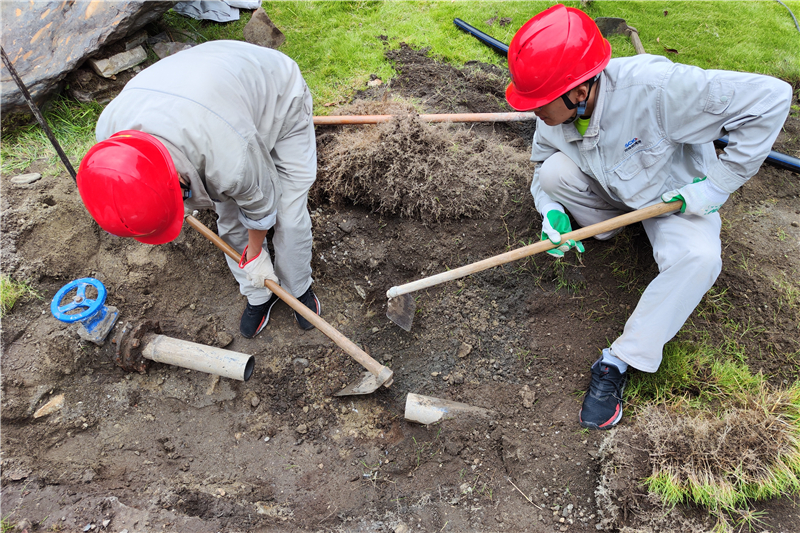 災(zāi)情就是命令,修復(fù)刻不容緩。9月6日早上8點(diǎn),公司第一時(shí)間對(duì)營(yíng)地儲(chǔ)備用桶裝水進(jìn)行統(tǒng)籌管理,引入附近農(nóng)戶小股山泉水,優(yōu)先滿足廚房用水。隨后,在保證人身安全的情況下,由設(shè)備檢修維護(hù)部和安全生產(chǎn)部成員組成搶修小組,拉網(wǎng)排查接待中心客房、員工宿舍樓管道隱患,及時(shí)封堵?lián)p壞管道,采取安全措施隔離損壞房間管路,搶修地震中受損的生活水取水系統(tǒng)管路。在搶修中遇到水管型號(hào)不同、管徑偏小的問(wèn)題,搶修小組積極應(yīng)對(duì),通過(guò)多次變徑的方式,將不同管徑的水管熱接連結(jié),巧妙解決搶修元件不足的問(wèn)題。針對(duì)接待中心預(yù)埋管受損太多,隱蔽創(chuàng)口修復(fù)面臨極大困難的情況,搶修小組采用鋪設(shè)明管方式暫時(shí)避開(kāi)接待中心供水管,從供水泵出口架設(shè)新管路。