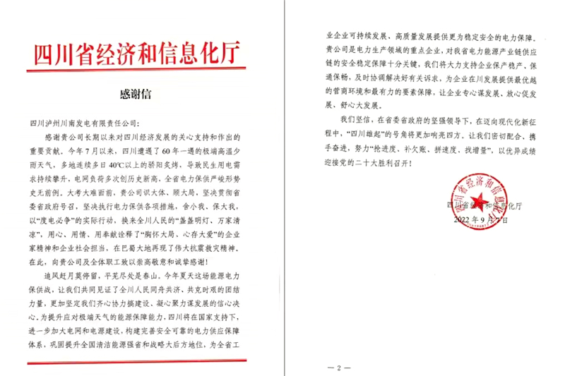 近日,四川省經(jīng)濟(jì)和信息化廳給川南發(fā)電發(fā)來(lái)一封感謝信,對(duì)川南發(fā)電在電力保供形勢(shì)異常嚴(yán)峻的2022年夏天彰顯出的社會(huì)擔(dān)當(dāng)和做出的重要貢獻(xiàn)表示誠(chéng)摯感謝。