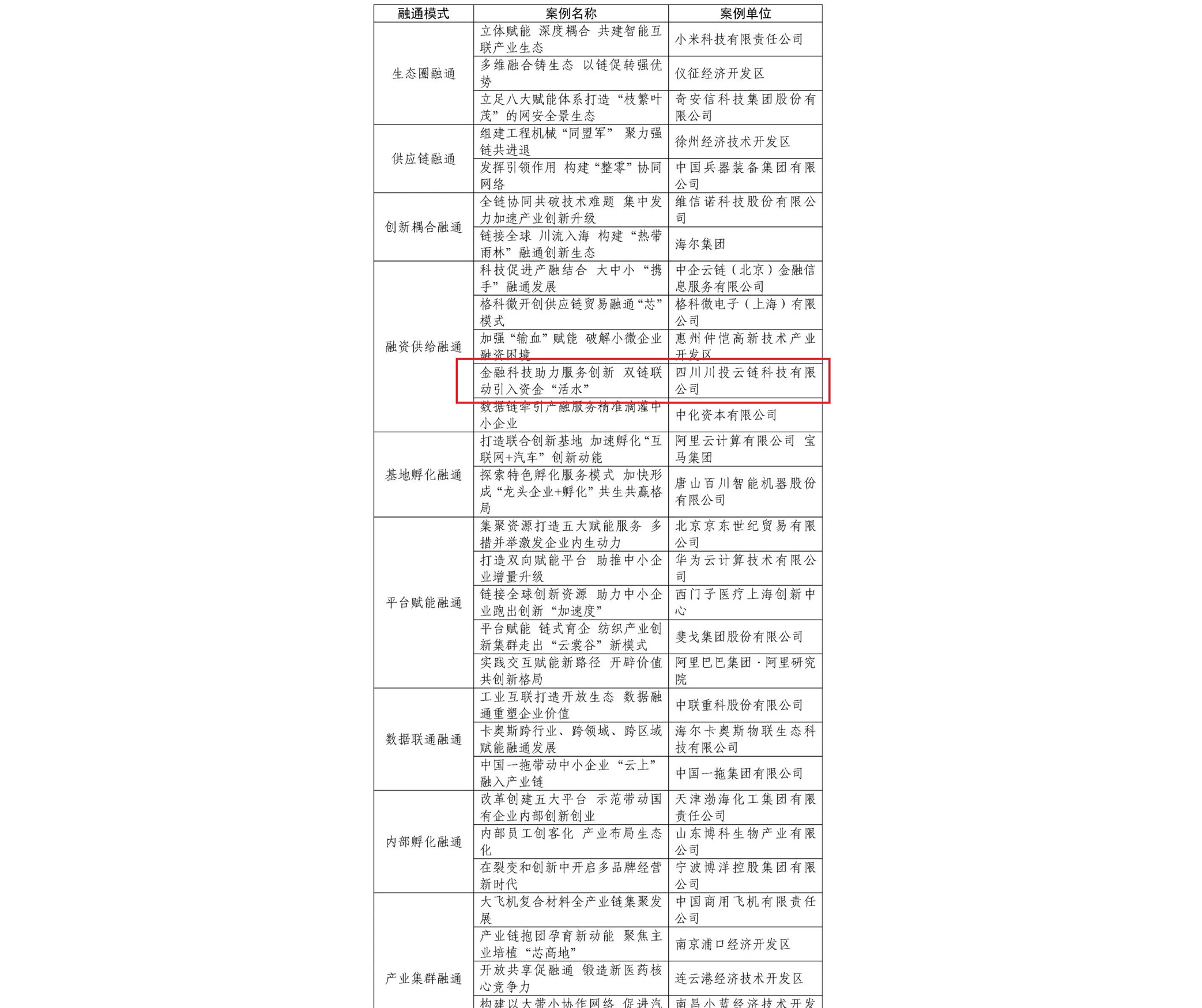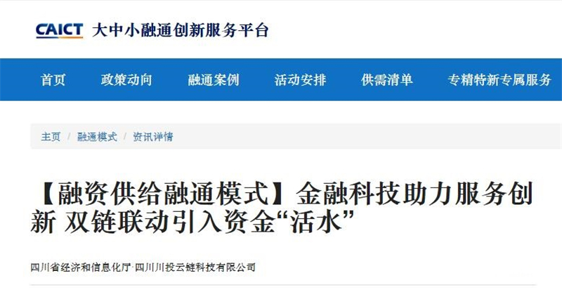 近日,工業(yè)和信息化部聯(lián)合國務(wù)院國資委、全國工商聯(lián)委托中國信通院征集的《大中小企業(yè)融通創(chuàng)新典型模式案例集(2022年)》(簡稱《案例集》)正式發(fā)布。經(jīng)四川省經(jīng)濟和信息化廳推薦,川投信產(chǎn)所屬川投云鏈公司“金融科技助力服務(wù)創(chuàng)新 雙鏈聯(lián)動引入資金‘活水’”的融資供給融通模式成功入選該案例集,并將在全國范圍內(nèi)推廣。