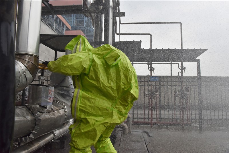 下午14時30分,演習(xí)正式拉開帷幕。根據(jù)演練情景設(shè)置,脫硫運行值班室消防噴淋動作聲光報警發(fā)出。監(jiān)盤主值班員通過DCS畫面和視頻監(jiān)控發(fā)現(xiàn)是尿素水解區(qū)尿素水解器A罐噴淋動作,立即安排巡檢人員現(xiàn)場查看。巡檢人員到達(dá)現(xiàn)場后,發(fā)現(xiàn)產(chǎn)品氣至1號機手動關(guān)斷門盤根處發(fā)生泄漏,導(dǎo)致鄰近的消防噴淋裝置動作,隨即匯報主值班員。主值班員及時將現(xiàn)場情況匯報值長,并安排值班員在保障供氨的情況下適當(dāng)降低產(chǎn)品氣壓力,同時聯(lián)系設(shè)備維修部機務(wù)一隊到現(xiàn)場處理,聯(lián)系消防隊到尿素水解區(qū)現(xiàn)場降低泄漏點氨氣濃度,協(xié)助保護(hù)檢修作業(yè)人員。設(shè)備維修部機務(wù)一隊檢修人員在穿戴好正壓式空氣呼吸器、重型防護(hù)服后,立即開展對產(chǎn)品氣至1號機手動關(guān)斷門盤根的處理工作。同時其余檢修人員加設(shè)臨時水泵,將消防噴淋水收集后排進(jìn)積水坑,轉(zhuǎn)運至廢水處理系統(tǒng)處置。演練過程中,參與人員按照演練方案,迅速行動,檢查、報告、指揮、救援處置、警戒等各個環(huán)節(jié)緊張有序。在大家的密切配合下,盤根處漏點被迅速控制,危險排除,防止了水解區(qū)氨氣高濃度聚集,甚至影響機組出口NOX超標(biāo)導(dǎo)致機組停運的危急情況發(fā)生,演練取得圓滿成功。