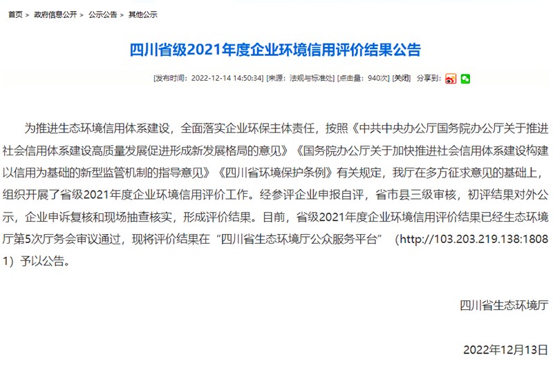 按照《中共中央辦公廳 國務(wù)院辦公廳關(guān)于推進(jìn)社會信用體系建設(shè)高質(zhì)量發(fā)展 促進(jìn)形成新發(fā)展格局的意見》《國務(wù)院辦公廳關(guān)于加快推進(jìn)社會信用體系建設(shè) 構(gòu)建以信用為基礎(chǔ)的新型監(jiān)管機(jī)制的指導(dǎo)意見》《四川省環(huán)境保護(hù)條例》有關(guān)規(guī)定,四川省生態(tài)環(huán)境廳組織開展了2021年度省級環(huán)境信用評價(jià)評選工作。先后歷經(jīng)參評企業(yè)申報(bào)自評,省、市、縣三級審核,初評結(jié)果對外公示,企業(yè)申訴復(fù)核和現(xiàn)場抽查核實(shí)等程序后,形成評價(jià)結(jié)果。目前,省級2021年度企業(yè)環(huán)境信用評價(jià)結(jié)果已經(jīng)生態(tài)環(huán)境廳第5次廳務(wù)會審議通過后正式對外公布。