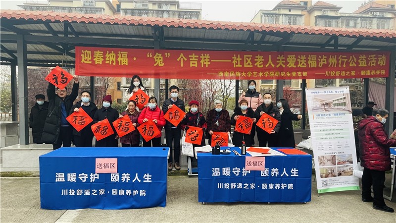 1月11日,川投大健康所屬“川投舒適之家?頤康養(yǎng)護(hù)院(瀘州)”聯(lián)合西南民族大學(xué)藝術(shù)學(xué)院、瀘州市龍馬潭區(qū)安寧街道社區(qū)衛(wèi)生服務(wù)中心舉行“迎春納福?‘兔’個(gè)吉祥——社區(qū)老人關(guān)愛送福瀘州行公益活動(dòng)”。
