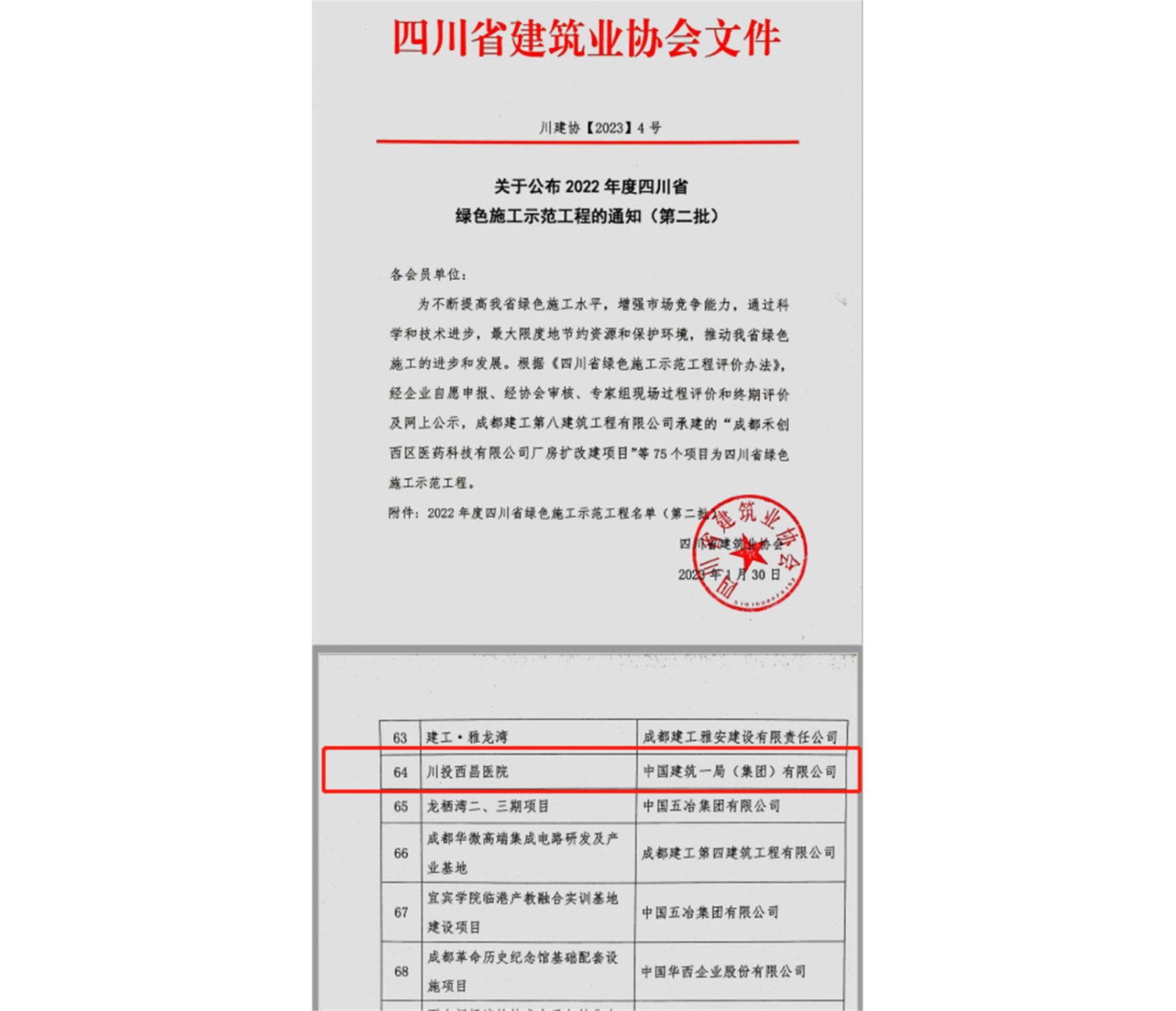 2023年1月30日,由川投集團開發(fā)建設的川投西昌醫(yī)院被四川省建筑業(yè)協(xié)會評選為2022年“四川省綠色施工示范工程”。