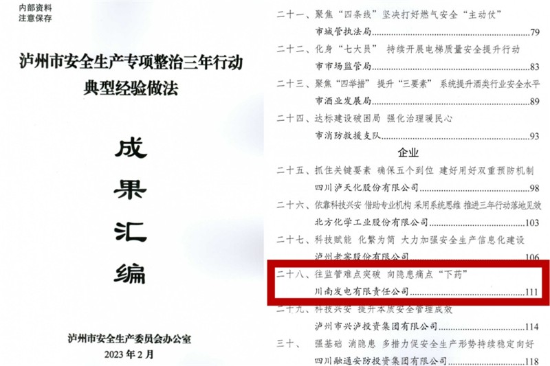2月7日,在瀘州市2023年安全生產(chǎn)、應(yīng)急管理、防災(zāi)減災(zāi)、森林防滅火工作會(huì)上,瀘州市安全生產(chǎn)委員會(huì)發(fā)布了《瀘州市安全生產(chǎn)專項(xiàng)整治三年行動(dòng)典型經(jīng)驗(yàn)做法成果匯編》,公司安全生產(chǎn)專項(xiàng)整治三年行動(dòng)工作的經(jīng)驗(yàn)做法成功入選。