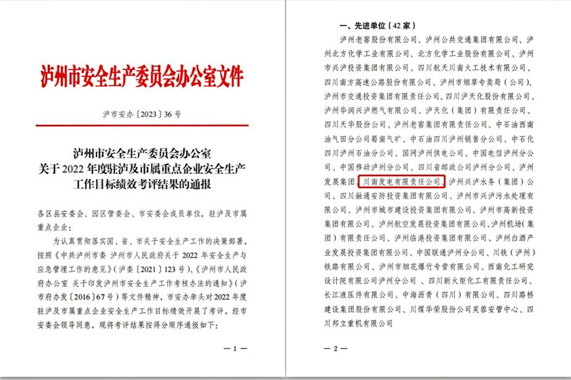 近日,瀘州市安全生產(chǎn)委員會辦公室印發(fā)了《關(guān)于2022年度駐瀘及市屬重點(diǎn)企業(yè)安全生產(chǎn)工作目標(biāo)績效考核的通報》,公司獲2022年度瀘州市安全生產(chǎn)“先進(jìn)單位”表彰。