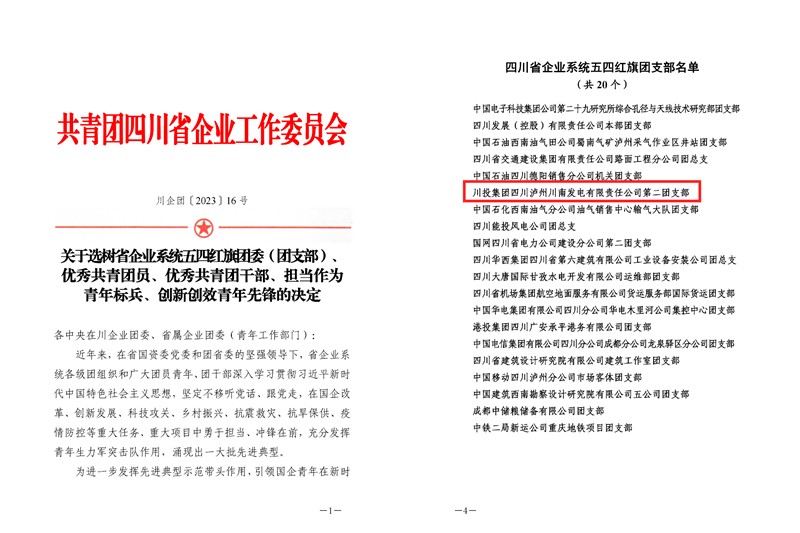 近日,共青團(tuán)四川省企業(yè)工作委員會(huì)發(fā)布《關(guān)于選樹省企業(yè)系統(tǒng)五四紅旗團(tuán)委(團(tuán)支部)、優(yōu)秀共青團(tuán)員、優(yōu)秀共青團(tuán)干部、擔(dān)當(dāng)作為青年標(biāo)兵、創(chuàng)新創(chuàng)效青年先鋒的決定》,川南發(fā)電公司第二團(tuán)支部被授予四川省企業(yè)系統(tǒng)五四紅旗團(tuán)支部。
