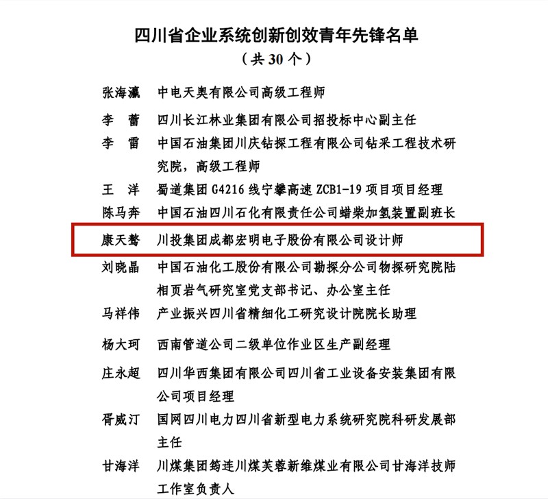 4月28日,共青團(tuán)四川省企業(yè)工作委員會公布了《關(guān)于選樹省企業(yè)系統(tǒng)五四紅旗團(tuán)委(團(tuán)支部)、優(yōu)秀共青團(tuán)員、優(yōu)秀共青團(tuán)干部、擔(dān)當(dāng)作為青年標(biāo)兵、創(chuàng)新創(chuàng)效青年先鋒的決定》(川企團(tuán)〔2023〕16號),川投信產(chǎn)所屬宏明電子康天驁同志榮獲“四川省國有企業(yè)創(chuàng)新創(chuàng)效青年先鋒”稱號。