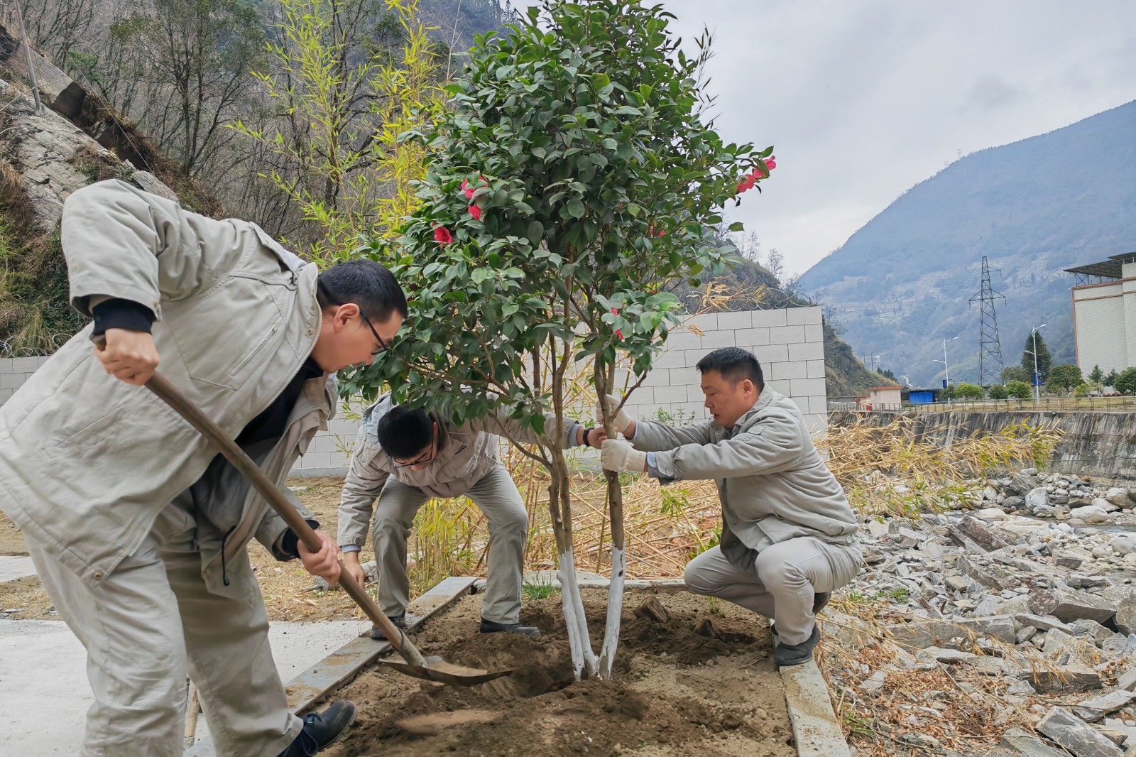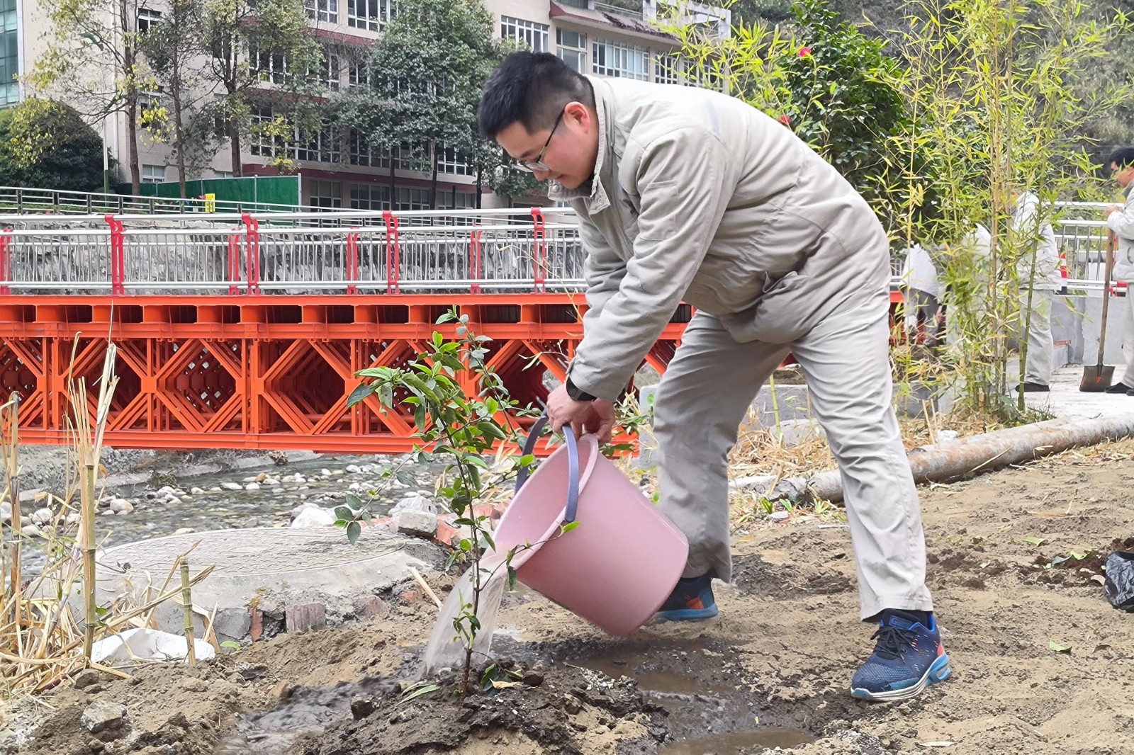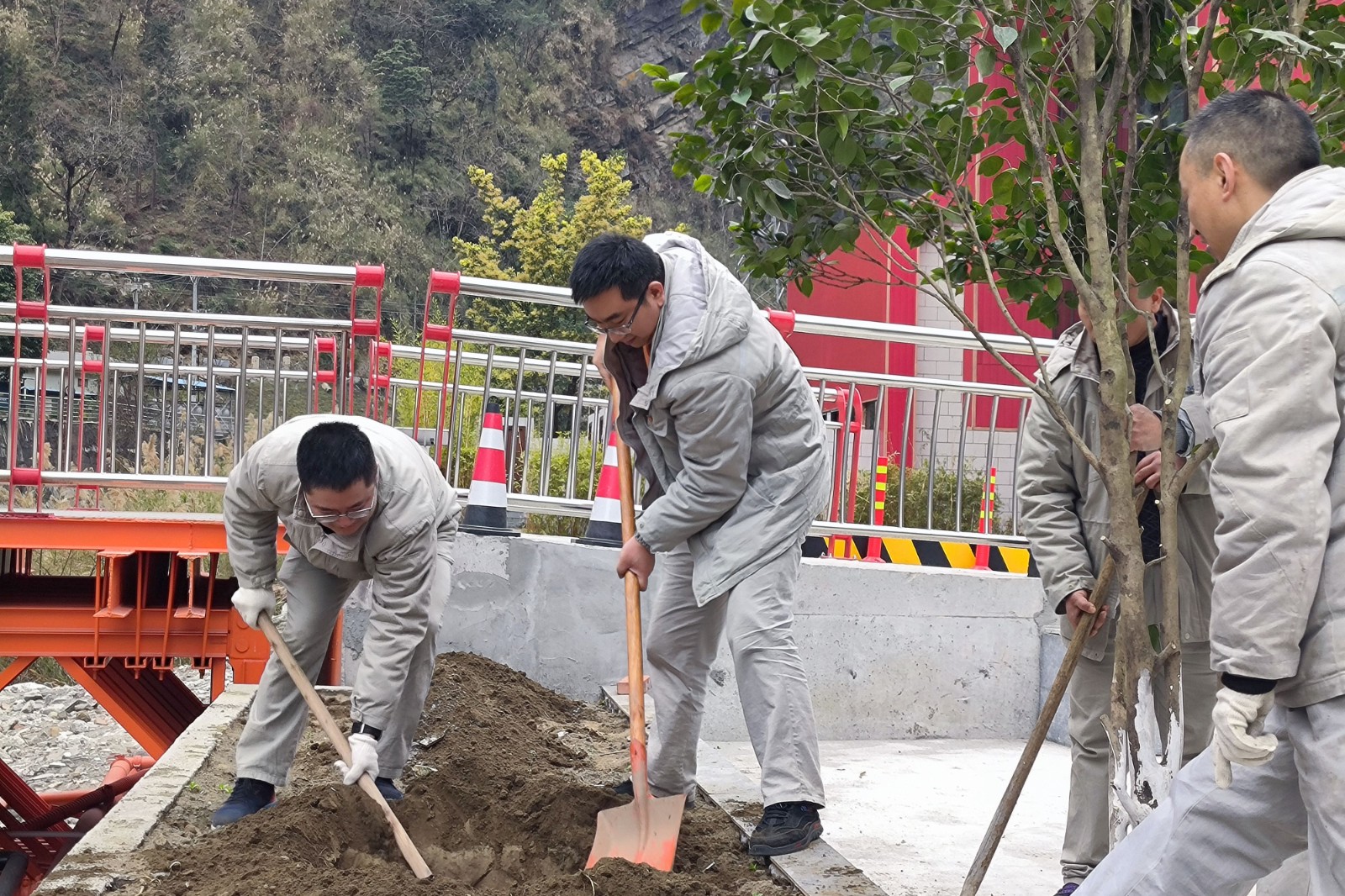 活動現(xiàn)場,大家熱情洋溢、干勁十足。搬運樹苗、揮鍬鏟土、扶樹填坑、培土圍堰、提水澆灌,每一個步驟都充滿了歡聲笑語,現(xiàn)場呈現(xiàn)出一派熱火朝天的熱鬧景象。大家精心協(xié)作,共種植了繡球、玉蘭、桂花、茶花、凌霄花等樹苗20余棵,為現(xiàn)場營地增添了一道靚麗的風景線。