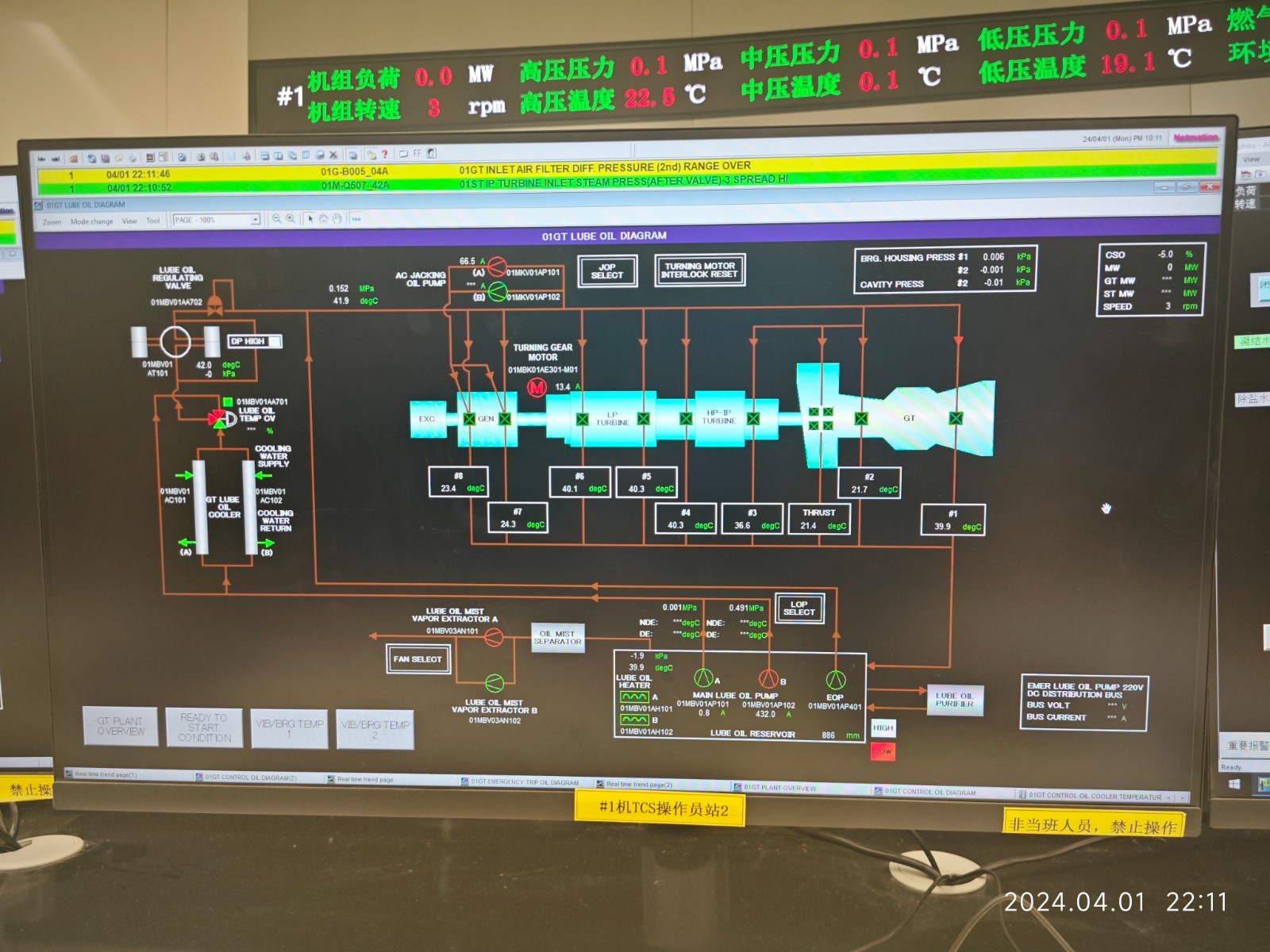 盤車投運(yùn)前,參建各單位汽機(jī)、電儀、調(diào)試相關(guān)專業(yè)人員按照施工、調(diào)試方案逐一檢查盤車條件,確認(rèn)機(jī)組軸系連接工作已完成、潤(rùn)滑油系統(tǒng)調(diào)試完畢并取得油質(zhì)合格報(bào)告、頂軸油系統(tǒng)調(diào)試完成、TCS監(jiān)控畫面正常投用。盤車運(yùn)行后,相關(guān)人員又對(duì)各項(xiàng)運(yùn)行參數(shù)進(jìn)行了詳細(xì)的檢查、檢測(cè),確認(rèn)燃機(jī)、汽輪機(jī)、發(fā)電機(jī)軸系各部件運(yùn)行狀態(tài)正常。