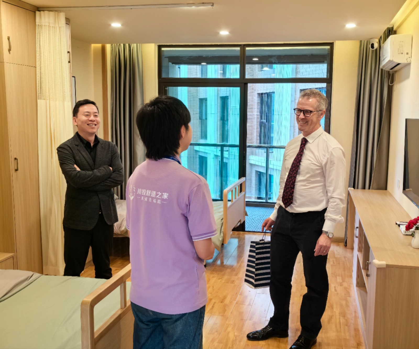 Ian Philip教授對川投盛櫸公司的熱忱接待表示感謝,他表示,川投舒適之家·武侯吉福院裝修設(shè)計別具特色、護(hù)理人員水平專業(yè)、長者生活幸福愉悅。希望雙方進(jìn)一步加深合作,通過優(yōu)勢互補(bǔ)、經(jīng)驗(yàn)互鑒、信息互通,激發(fā)養(yǎng)老照護(hù)模式本地化實(shí)踐的創(chuàng)新活力,共同成為建設(shè)引領(lǐng)積極、健康老齡化大潮的典范。