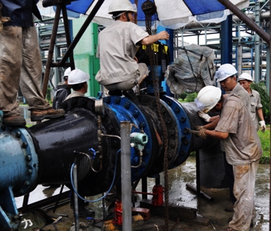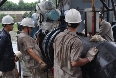 由于16日晚到17號上午的持續(xù)暴雨,造成了江邊取水泵房旁的山體塌方,廠區(qū)取水管道,電線電纜統(tǒng)統(tǒng)拉斷,取水工作已無法進行。公司領(lǐng)導迅速組織各部門緊急會診,提出新敷設(shè)管道并入樂電天威江邊取水管道的方案,在得到樂電天威的支持后立即實施,電氣維修員在最短的時間內(nèi)搶修好配電箱,建立了臨時施工電源,確保了碰口工作順利完成。