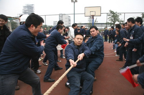 下午14:00,拔河比賽準(zhǔn)時(shí)開始。當(dāng)兩個(gè)拔河參賽隊(duì)力量長(zhǎng)時(shí)間相持不下時(shí),周圍的員工為雙方加油的喊聲一浪高過一浪。每個(gè)隊(duì)每名隊(duì)員誰也不甘示落,每一輪比賽都競(jìng)爭(zhēng)激烈,充滿了生氣,整齊劃一的加油鼓勁聲激蕩著在場(chǎng)的每一個(gè)人的心。