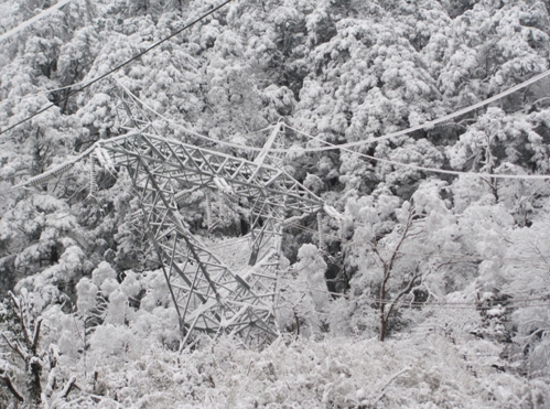 3月24日罕見的暴雪,使仁宗海氣溫降至-12.5℃,地面積雪達30厘米,出線場設(shè)備和所有線路嚴重積雪覆冰,“引田入環(huán)”首部10KV界然線接地故障長時間無法送電;金窩變電站避雷器凍裂,廠房10KVⅠ段的過電壓保護器爆炸退出運行,10KV金紅線線路保護跳閘停電,220KV金仁線保護動作跳閘;大發(fā)電站至蝶閥室10KV供電線路電桿倒塌2處,912開關(guān)保護動作跳閘;流域外來電源35KV線路桿塔傾倒造成唐家溝變電站全停,外來電源消失;全流域公路被大雪阻斷,沿途傾倒的樹木、竹子隨處可見,電站值班現(xiàn)場生活物質(zhì)保障出現(xiàn)困難。