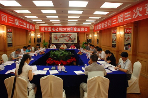 6月12日,川南發(fā)電公司2011年度“三會”(股東會、董事會、監(jiān)事會)在成都召開。會議由川投集團(tuán)公司副總經(jīng)理、川南發(fā)電公司董事伍康定(受郭勇董事長委托,代行董事長職責(zé))主持。川南發(fā)電公司董事郭愛國、張維群、肖群英、李勝章、唐得旗,監(jiān)事會主席任明霞,監(jiān)事鄭世紅、宋詠梅參加會議。川南發(fā)電公司相關(guān)管理人員譚先明、謝偉平、邱濤、黃松、劉云戈等列席會議。