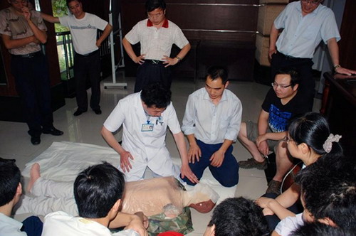 培訓(xùn)會(huì)上,謝繼林醫(yī)生結(jié)合發(fā)電企業(yè)生產(chǎn)現(xiàn)場發(fā)生的真實(shí)案例,采用理論講解、圖示和現(xiàn)場演示相結(jié)合的方式,詳細(xì)講解了 “最新國際心肺復(fù)蘇指南”、“SF6封閉組合電器漏氣及處理措施”、“觸電燒傷及其搶救措施”、“淺部軟組織創(chuàng)傷及其處理”、“熱力燒傷及其處理”、“急性損傷中毒的化學(xué)、物理因素及其搶救步驟和原則”等方面的知識(shí),并利用橡皮人進(jìn)行了模擬救護(hù)操作示范。電站現(xiàn)場參培訓(xùn)人員按照拍、喊、看、摸、聽等步驟,對橡皮人分別進(jìn)行了單人和雙人胸外按壓、口對口(鼻)人工呼吸救護(hù)操作。謝繼林醫(yī)生對操作不規(guī)范的員工認(rèn)真進(jìn)行了糾正,直到全部掌握操作要領(lǐng)并通過檢測。