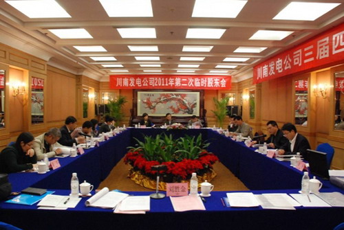 2011年11月16日,四川瀘州川南發(fā)電有限責(zé)任公司(以下簡稱公司)2011年第二次臨時股東會、三屆四次董事會在四川成都召開。會議由川投集團(tuán)公司副總經(jīng)理、公司董事伍康定主持。公司副董事長王文琦,董事郭愛國、張維群、肖群英、李勝章、唐得旗參加會議。監(jiān)事會主席任明霞,監(jiān)事鄭世紅、黃泰慧及公司相關(guān)管理人員譚先明、謝偉平、黃松、劉云戈等列席會議。