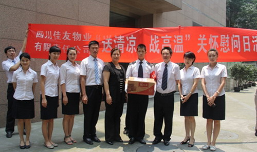 7月中旬,已進(jìn)入三伏天氣,夏日炎炎,各地氣溫居高不下。在成都最高氣溫已經(jīng)達(dá)到32℃的炎熱環(huán)境下,佳友物業(yè)的員工們?nèi)匀幻爸崾顖?jiān)守在自己的崗位上。為了表達(dá)公司對員工的關(guān)懷之情,2012年7月13日中午,公司董事長穆婷云親自帶隊(duì),總經(jīng)理王賓、總經(jīng)理助理史健陪同,來到川投物業(yè)服務(wù)中心各一線崗位,為員工們送去夏日的一絲清涼、一絲關(guān)懷。