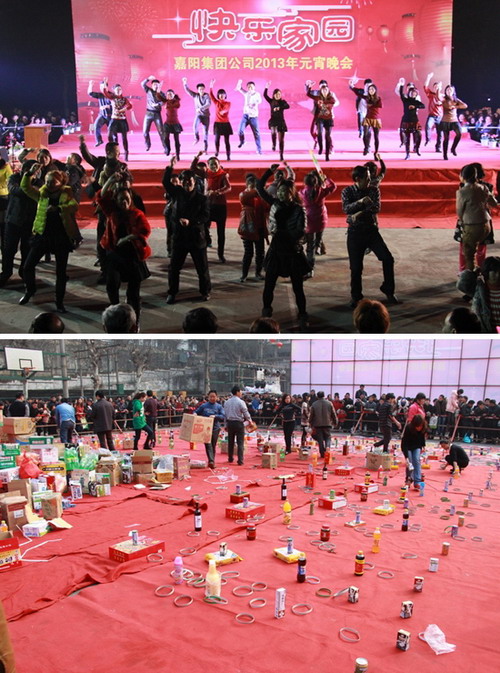 9點(diǎn)30分,廣場(chǎng)文藝和實(shí)物套圈在官斗山同步進(jìn)行。舞蹈《大家唱首新年歌》拉開(kāi)廣場(chǎng)文藝了帷幕,《全家歡》、《長(zhǎng)發(fā)飄香》、《歡慶腰鼓》等舞蹈次第展開(kāi),《雪域踢踏》、《高原是我家》展現(xiàn)了不同民族的不同特色,《琴臺(tái)古韻》、《釣魚島》進(jìn)一步豐富了廣場(chǎng)文藝活動(dòng)的內(nèi)容,《今宵共舉杯》表達(dá)了職工家屬對(duì)企業(yè)的美好祝愿。