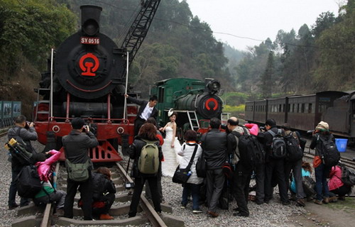 今年春來早,花開正當(dāng)時(shí)。春暖花開之際,嘉陽小火車又迎來了別樣的浪漫之旅。3月1日來自成都、宜賓和樂山的78位攝影愛好者和游客坐上了一趟獨(dú)具特色的婚紗模特?cái)z影專列。嘉陽小火車2013年“花季之旅”也正式拉開序幕。