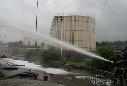 演習(xí)設(shè)定,運(yùn)行值班人員在發(fā)現(xiàn)油庫著火情況后,迅速采取現(xiàn)場(chǎng)關(guān)閉進(jìn)出口油閥,并用泥沙將因油泵房附近近200公升的積油形成的流動(dòng)火隔離,同時(shí)將火情迅速上報(bào),公司立即宣布啟動(dòng)油庫著火應(yīng)急預(yù)案。隨后各參演單位迅速到位,在搶險(xiǎn)應(yīng)急指揮部的指揮下,對(duì)燃油系統(tǒng)進(jìn)行了隔離,并切斷了油庫區(qū)所有電源,并迅速疏散周邊人員,設(shè)置了警戒線,消防隊(duì)員快速利用油罐區(qū)內(nèi)的固定泡沫滅火裝置的泡沫槍和消防車的泡沫槍從各個(gè)方向集中對(duì)準(zhǔn)火源中心處噴射,封住火焰使油氣隔絕缺氧熄滅。同時(shí),參演義務(wù)消防人員迅速趕赴現(xiàn)場(chǎng)協(xié)助專職消防隊(duì)進(jìn)行滅火。