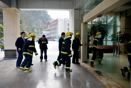 11月19日15時(shí)40分,田灣河公司電站現(xiàn)場(chǎng)營地接待中心物業(yè)值班員向營地保衛(wèi)值班室報(bào)火警:接待中心三樓電纜線井發(fā)生火災(zāi),有大量毒煙,火勢(shì)未得到控制,并有增大跡象,目前正在組織疏散撤離,暫無人員受傷,請(qǐng)快速組織人員增援救火。同時(shí),值班人員大聲呼喊:著火啦!??!所有人員快速撤離接待中心大樓?。。?BR> 情況緊急,值班人員接到報(bào)警后立即向火災(zāi)事故應(yīng)急辦公室技術(shù)與安全部負(fù)責(zé)人報(bào)告,爾后又層層向公司現(xiàn)場(chǎng)值班領(lǐng)導(dǎo)、公司總經(jīng)理報(bào)告??偨?jīng)理指示立即成立火災(zāi)事故應(yīng)急救援指揮部,現(xiàn)場(chǎng)由熊宇負(fù)責(zé)指揮。按總指揮要求,現(xiàn)場(chǎng)指揮長命令:拉響警報(bào)器,啟動(dòng)火災(zāi)事故二級(jí)應(yīng)急響應(yīng),疏散組快速組織接待中心大樓人員安全撤離,滅火行動(dòng)組立即組織兼職消防隊(duì)員、義務(wù)消防隊(duì)員投入滅火戰(zhàn)斗......一道道緊急命令從指揮部發(fā)出,各應(yīng)急救援小組快速集結(jié),按公司火災(zāi)事故應(yīng)急預(yù)案有序開展救援行動(dòng)。