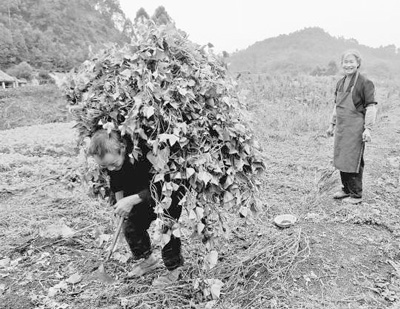 從礦區(qū)入口石溪到礦區(qū)盡頭芭蕉溝,途經(jīng)2號井所在地焦壩。附近矸石場被推平復(fù)墾后,分給退休工人耕種,紅苕、豆子、油菜一茬接著一茬,既美化環(huán)境,又有收益。一對70多歲的老夫婦正在收紅苕。“地不種,拋荒了多可惜。”老媽媽說,堆矸場復(fù)墾,皆大歡喜。