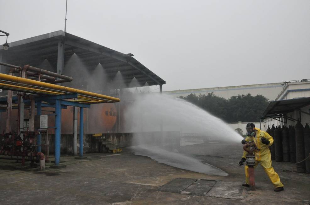 為貫徹落實《關(guān)于開展隱患排查治理專項行動的通知》要求,進一步強化人員安全責(zé)任意識,全面檢驗事故應(yīng)急處置能力,使員工在遇到液氨突然發(fā)生泄漏時,能夠及時有序撤離,保證生命安全,最大限度地減少液氨泄漏造成的損失。本次演練共分液氨泄漏消防噴淋稀釋、隔離倒罐、安全警戒與疏散、液氨中毒醫(yī)療救護、液氨泄漏周圍環(huán)境監(jiān)測5個環(huán)節(jié)。