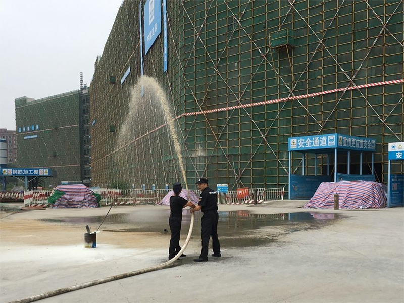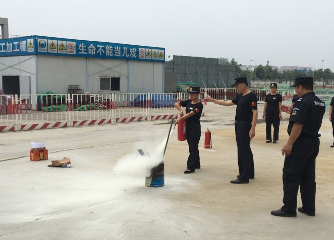 本次消防安全演練主要包含兩個(gè)科目,第一個(gè)科目是使用手提式干粉滅火器對明火進(jìn)行撲滅,參加演練的安保人員手提滅火器快速奔赴起火地點(diǎn),在距明火適中的位置放下滅火器,打開鉛封,拔掉保險(xiǎn)銷,左手拿噴管對準(zhǔn)明火,右手提壓把手持續(xù)按壓,將火撲滅;第二個(gè)科目是安保人員相互配合使用消火栓進(jìn)行滅火,一人打開消火栓后取出消防水帶向起火點(diǎn)方向拋出,然后將消防水帶的一頭與閥門連接,另一人則接好槍頭和消防水帶奔向起火點(diǎn),站定后通知后方打開閥門并將槍頭對準(zhǔn)起火點(diǎn)進(jìn)行滅火。