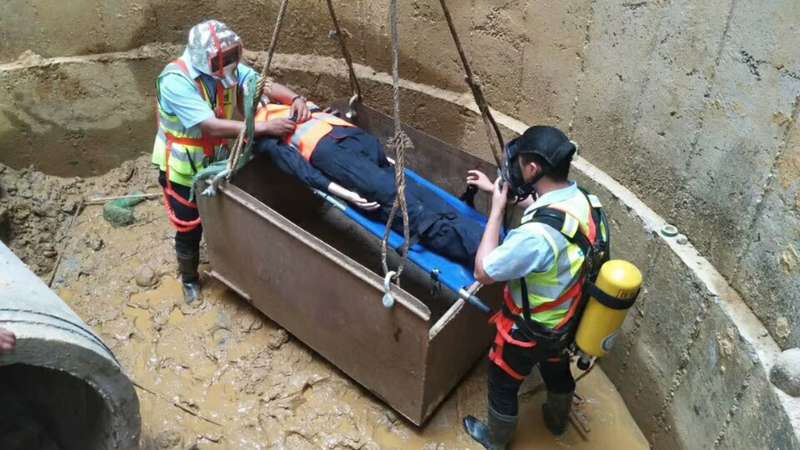 演練活動中,現(xiàn)場用假人模擬工作井內(nèi)傷員,然后由安全救援隊員佩戴有限空間救援裝備,從扶梯下至工作井內(nèi)將傷員固定在擔(dān)架上,并通過井外吊車協(xié)助將傷員運出工作井。當(dāng)傷員被運到地面后,救援隊員馬上對傷員進行醫(yī)療設(shè)備供氧和心肺復(fù)蘇等救援行動。