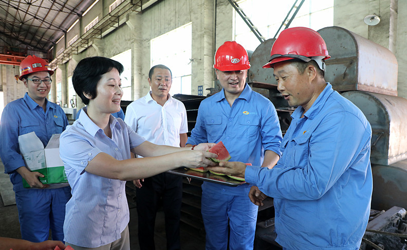 白書記一行先后來(lái)到川投峨旅石溪小火車檢修車間、礦山機(jī)械制造維修分公司進(jìn)行慰問(wèn)。在一臺(tái)正在運(yùn)行的蒸汽機(jī)車旁,白主席向司機(jī)、司爐師傅遞上西瓜,送上集團(tuán)公司黨政領(lǐng)導(dǎo)的慰問(wèn)與關(guān)懷,她動(dòng)情地對(duì)司爐工說(shuō),“你們持續(xù)在高溫環(huán)境下工作很辛苦,要千萬(wàn)注意自身防暑降溫,注意安全”。車間里每個(gè)崗位的職工她都一一送上了清涼的西瓜和礦泉水,把組織的關(guān)愛(ài)傳遞到職工身邊。