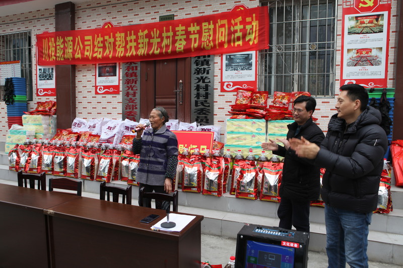 慰問現(xiàn)場(chǎng),冉書記代表公司黨委和全體員工,對(duì)新光村父老鄉(xiāng)親表示誠摯的新春祝福和問候。冉書記指出,黨的十九大吹響了全面消滅貧困、實(shí)現(xiàn)小康號(hào)角,經(jīng)過幾年的努力,川投能源對(duì)口幫扶村面貌煥然一新,這得益于黨和國家的好政策,得益于扶貧干部和當(dāng)?shù)卮甯刹康墓餐Γ靡嬗趶V大鄉(xiāng)親父老的勤勞、智慧和汗水。接下來,川投能源將繼續(xù)深入貫徹中央、省委及集團(tuán)公司精準(zhǔn)脫貧精神,創(chuàng)新扶貧工作思路,提高幫扶工作標(biāo)準(zhǔn),立足實(shí)際,努力為幫扶村群眾辦更多的實(shí)事、好事,以優(yōu)異的工作業(yè)績(jī)喜迎新中國成立70周年。