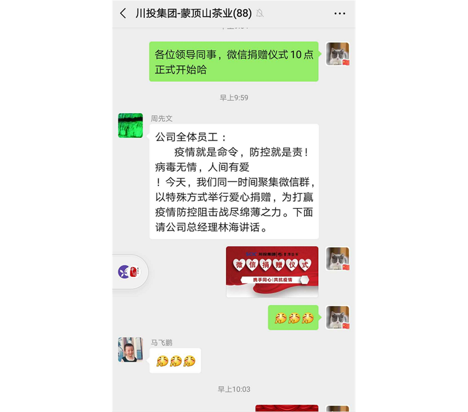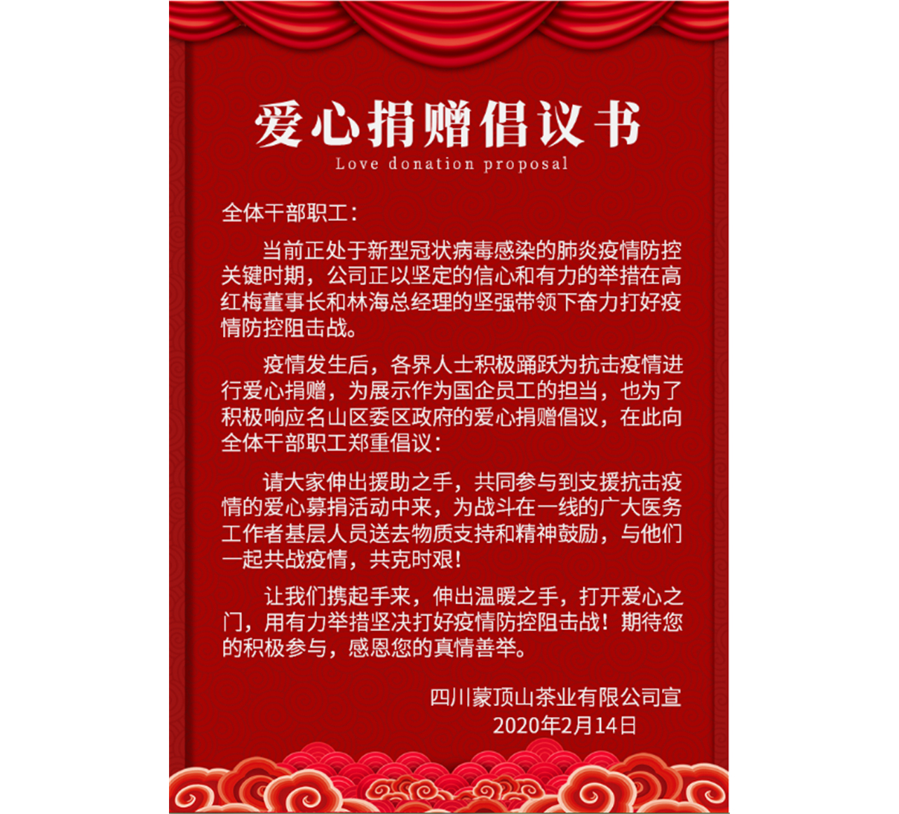 在當(dāng)前新冠病毒感染的肺炎疫情防控的關(guān)鍵時(shí)期,四川蒙頂山茶業(yè)有限公司在董事長(zhǎng)高紅梅和總經(jīng)理林海的帶領(lǐng)下積極響應(yīng)黨和政府號(hào)召,認(rèn)真落實(shí)川投集團(tuán)黨委的指示精神,做在一線,走在前列,用實(shí)際行動(dòng)踐行國(guó)企擔(dān)當(dāng),于2020年2月14日上午十點(diǎn)用一種特殊的方式“聚”在一起,通過(guò)微信工作群向全體職工發(fā)起了向疫情防控一線愛(ài)心捐贈(zèng)活動(dòng)。