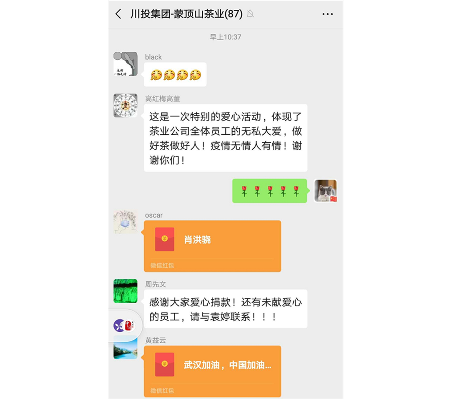董事長(zhǎng)高紅梅在群里肯定了大家的善舉,她說(shuō):這是一次特別的愛(ài)心活動(dòng),體現(xiàn)了茶業(yè)公司全體員工的無(wú)私大愛(ài),做好茶做好人!疫情無(wú)情人有情!