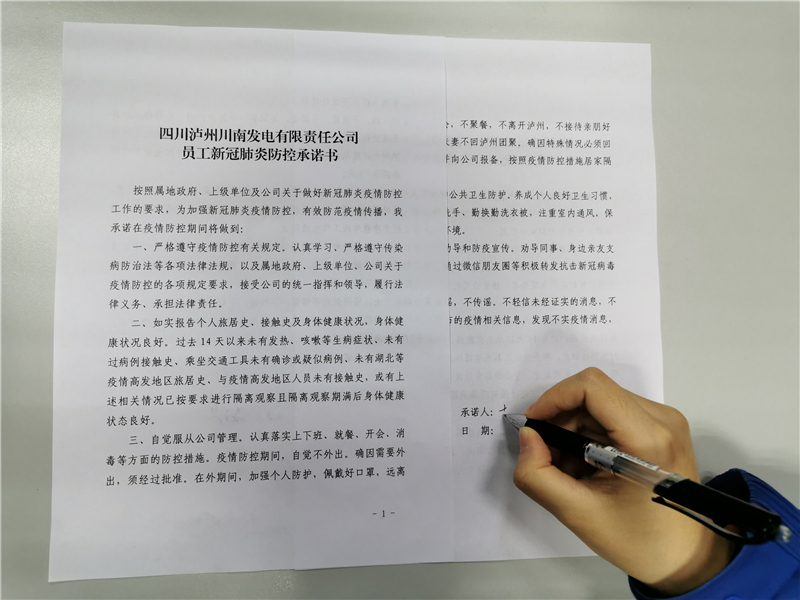 為適應(yīng)疫情防控新形勢,建立橫向到邊、縱向到底的疫情防控全員責(zé)任體系,加強(qiáng)管控,齊心協(xié)力持續(xù)打好疫情防控阻擊戰(zhàn),切實(shí)保障員工個人及其家人身體健康和生命安全,2月24日,川南發(fā)電公司印發(fā)了《關(guān)于開展新冠肺炎疫情防控全員承諾的通知》,發(fā)動公司全體員工、勞務(wù)工、外委合同單位簽訂新冠肺炎疫情防控承諾書。