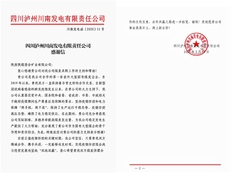 2月19日,川南發(fā)電公司向陜西陜煤澄合礦業(yè)有限公司發(fā)出感謝信,表達(dá)對(duì)陜煤澄合公司在新冠肺炎疫情期間向川南發(fā)電公司加大長(zhǎng)協(xié)煤合作,保障電煤穩(wěn)定供應(yīng)的誠(chéng)摯感謝!