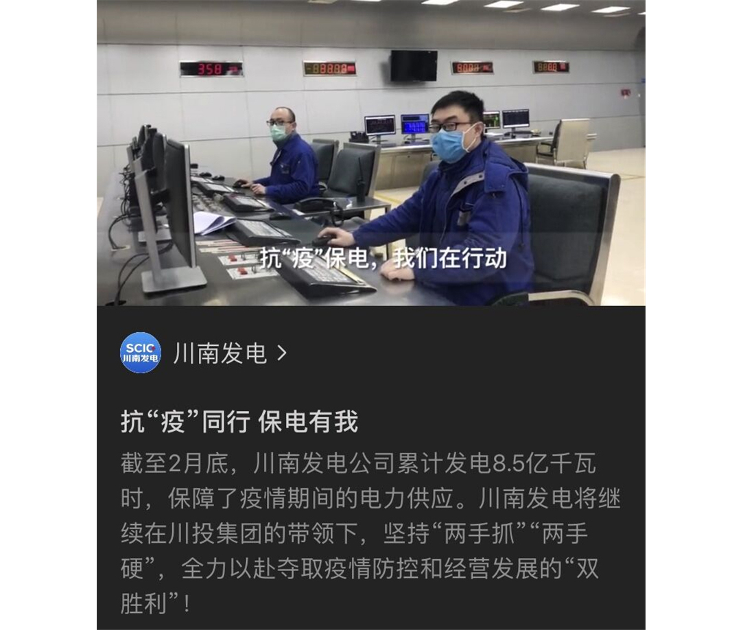 為進一步堅定公司干部職工誓奪“雙勝利”的信心,提振公司一手抓疫情防控一手抓經(jīng)營發(fā)展的戰(zhàn)斗士氣,3月2日,川南發(fā)電公司拍攝完成了《抗“疫”同行,保電有我》微視頻。該視頻經(jīng)在微信公眾號上發(fā)布,取得了較好的宣傳效果。
