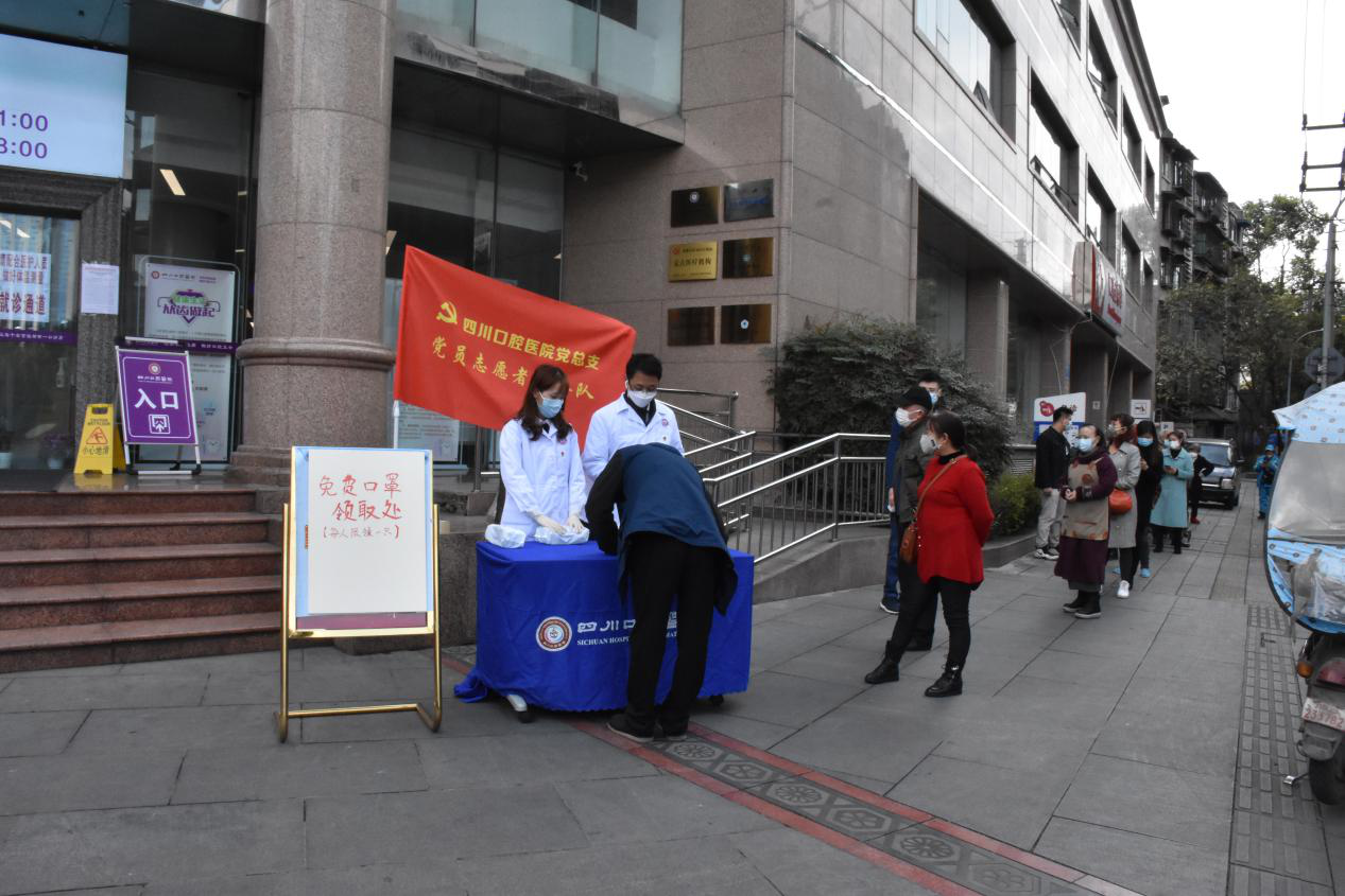疫情面前,一名黨員就是一面光輝的旗幟,一個黨組織就是一個堅強的戰(zhàn)斗堡壘,抗擊疫情是全社會的責任,更是共產(chǎn)黨員的使命擔當。為積極承擔社會責任,充分發(fā)揮了戰(zhàn)斗堡壘作用和先鋒模范作用,3月1日復診當天,四川口腔醫(yī)院組織起一支“黨員志愿者先鋒隊”,每天上午10點在醫(yī)院門外設點免費派發(fā)口罩,為了避免人員聚集,黨員志愿者們有序組織、有效防范,全力為市民朋友提供便利。